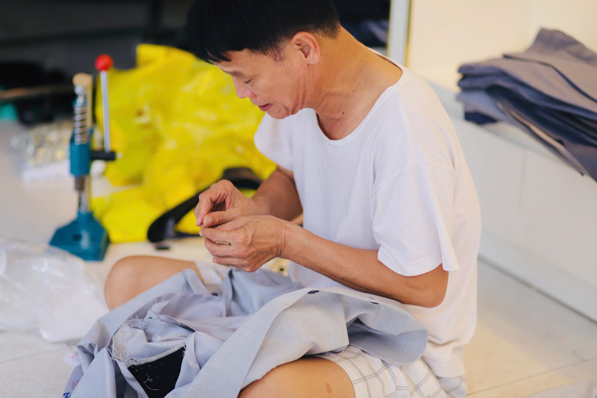 Ông Hùng ngồi tra tay áo để khách đặt may tới thử.